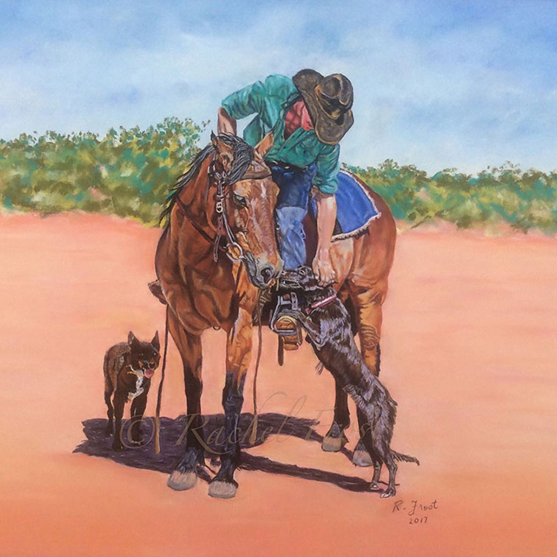 Painted in soft pastels and inspired by real working life, this artwork honours the bond between people and animals who live and work together on the land. It's a tribute to loyalty, to long days in the dust, and to the unspoken understanding built over time.