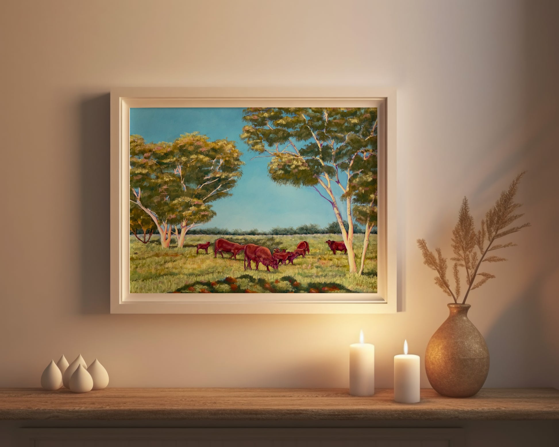 “Where the Ghost Gums Watch” captures a moment of quiet truth in the Australian landscape—where pale ghost gums stand like gentle sentinels and cattle graze in calm familiarity. This pastel artwork invites viewers into a place that feels both timeless and intimately known, as though the land itself remembers them.